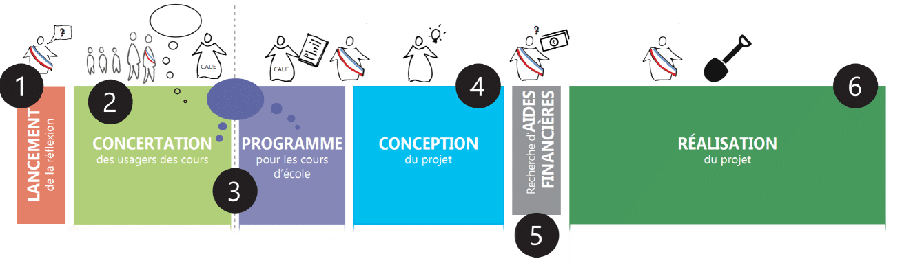 Le CAUE travaille à partir du duo élu/équipe pédagogique auquel s’ajoute les équipes techniques, les acteurs du périscolaire, les parents d’élèves et les élèves.
